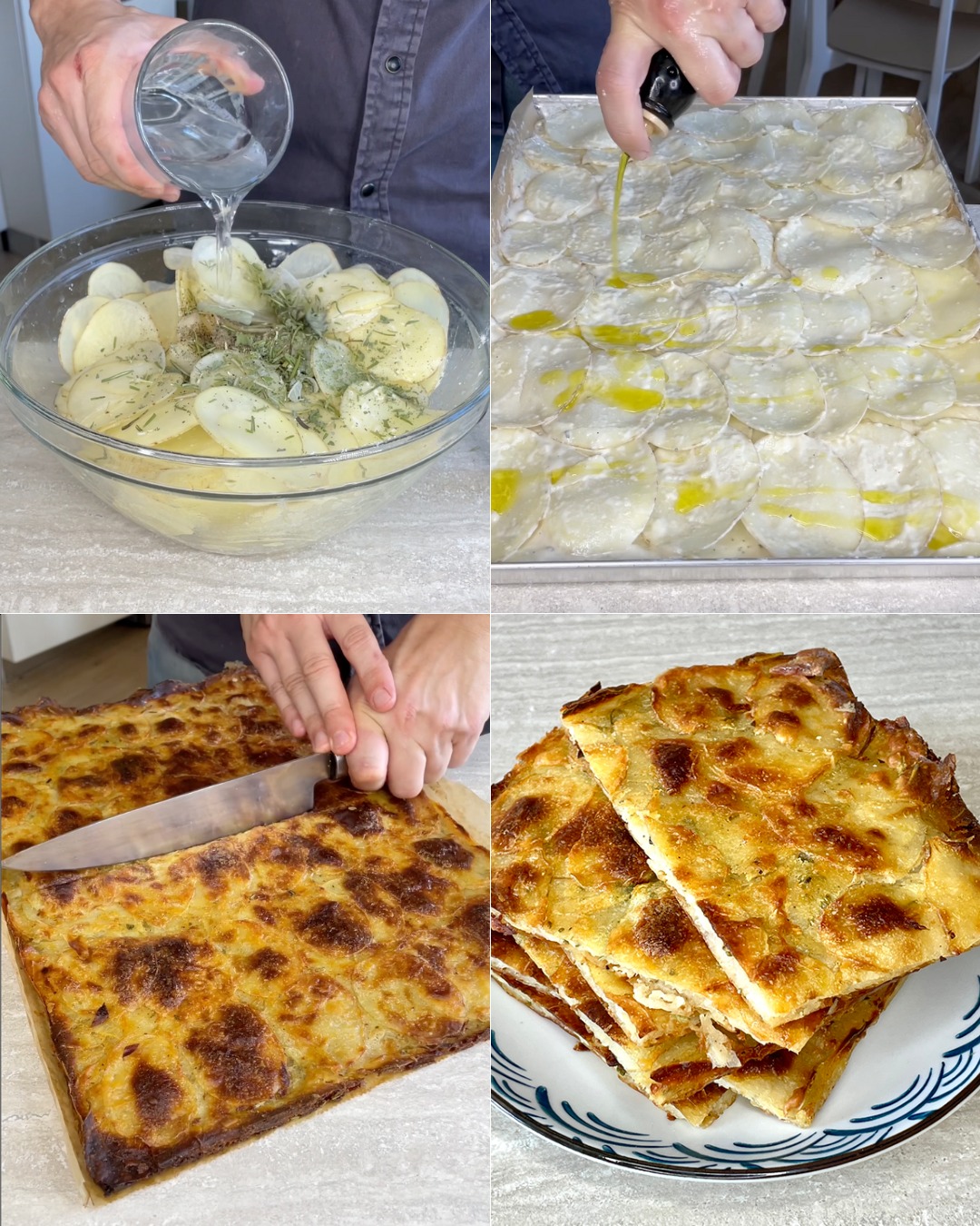 Le patate vanno tagliate a fettine sottili con tutta la buccia, preferibilmente con una mandolina, e mescolate con acqua, farina, parmigiano e aromi. Il composto sarà poi versato in una teglia rivestita con carta forno e cotto per circa 40 minuti. Alla fine, la schiacciata sarà dorata e croccante in superficie, perfetta da gustare tiepida o fredda.